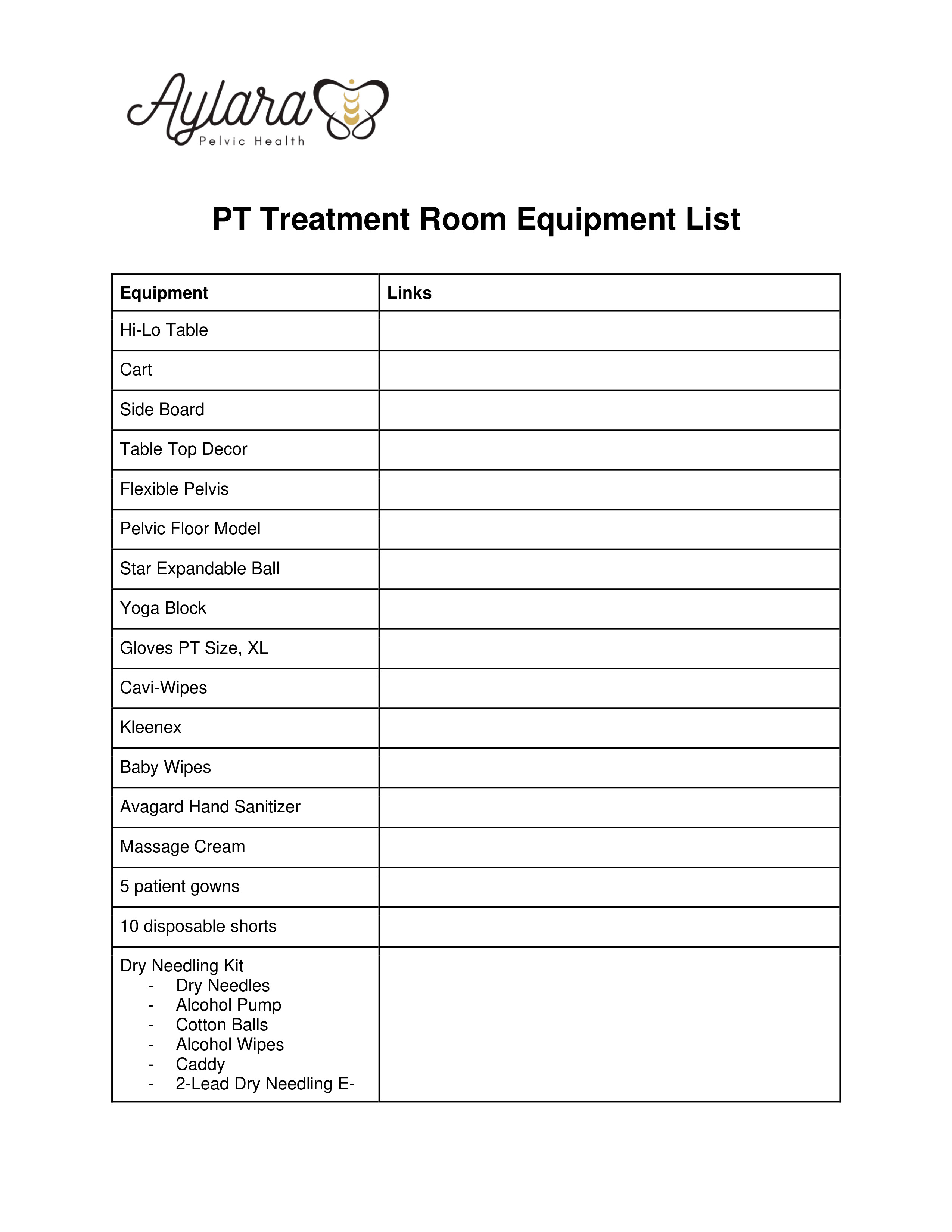 PT Treatment Room Equipment List